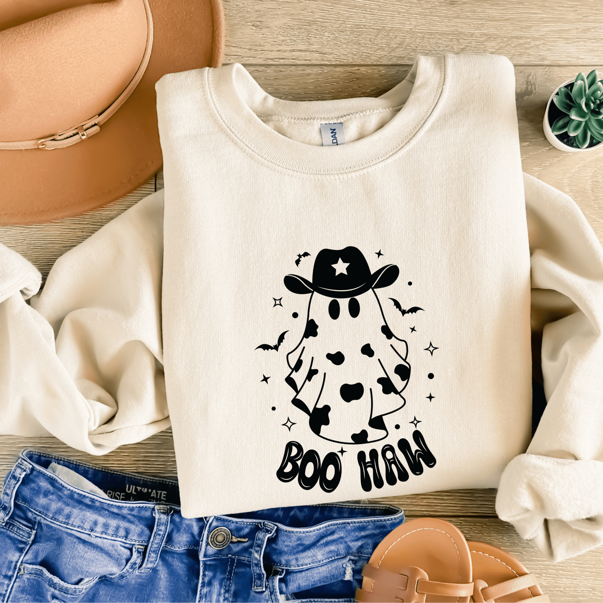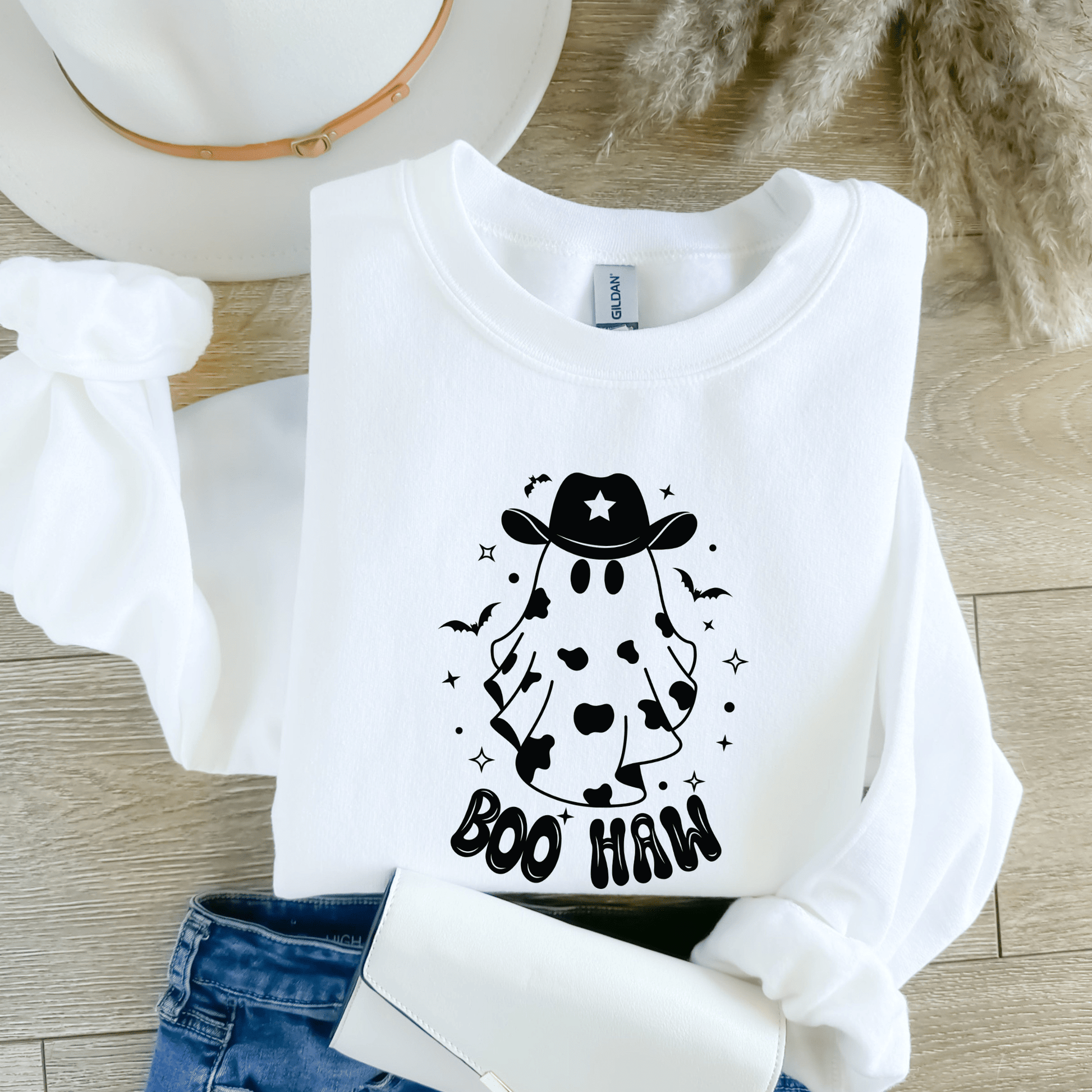 This Halloween crewneck is sure to turn heads with its classic cowgirl vibe and unique cow ghost print.