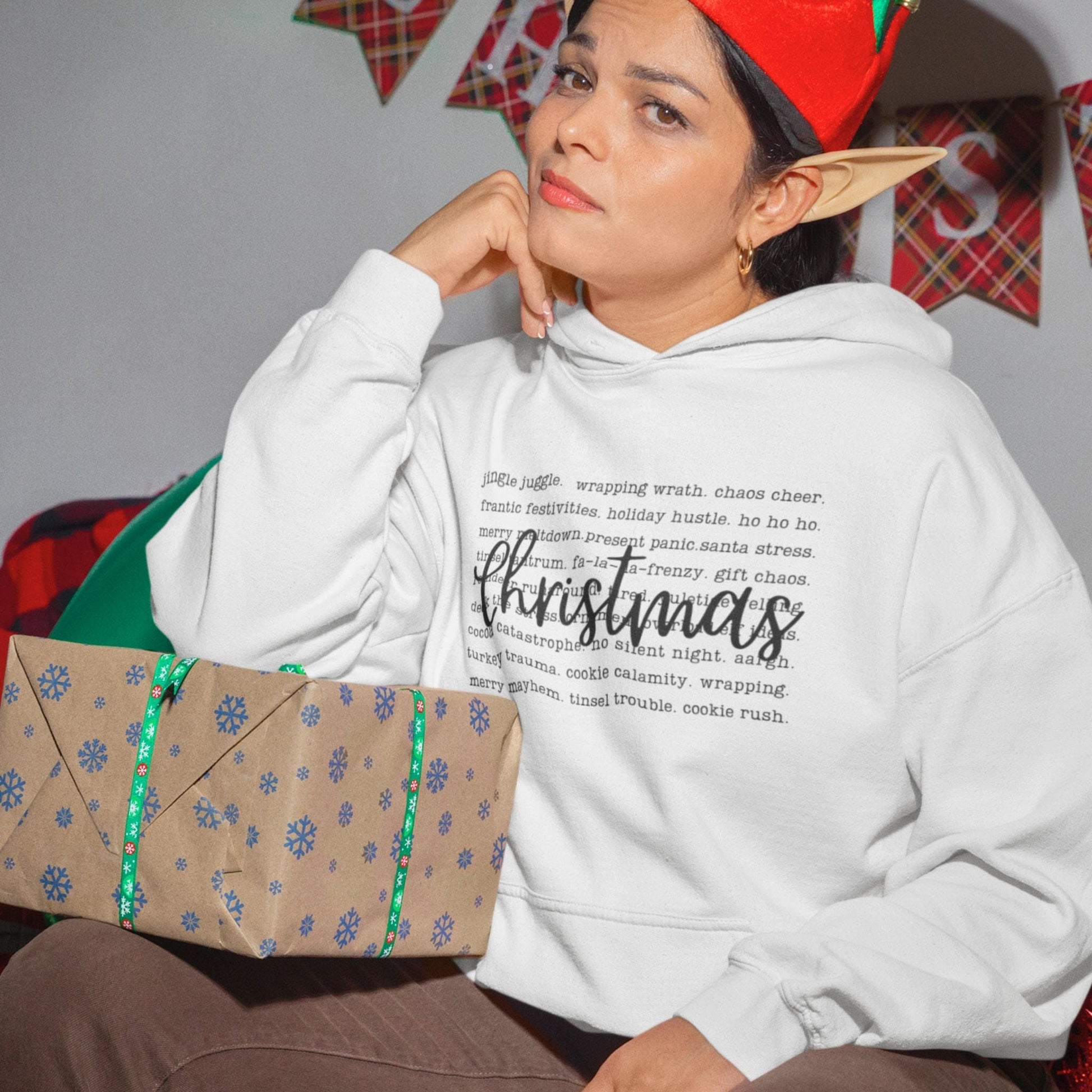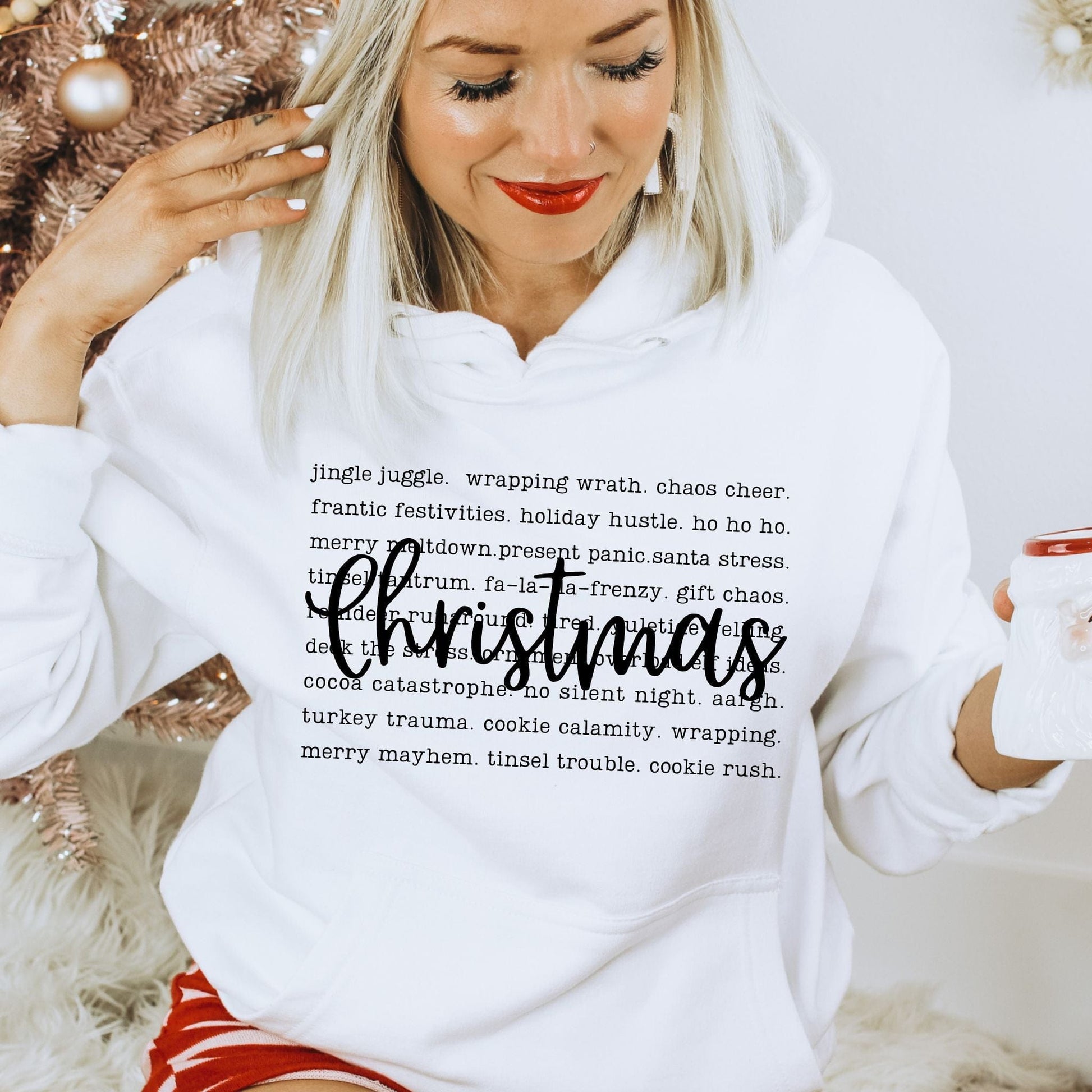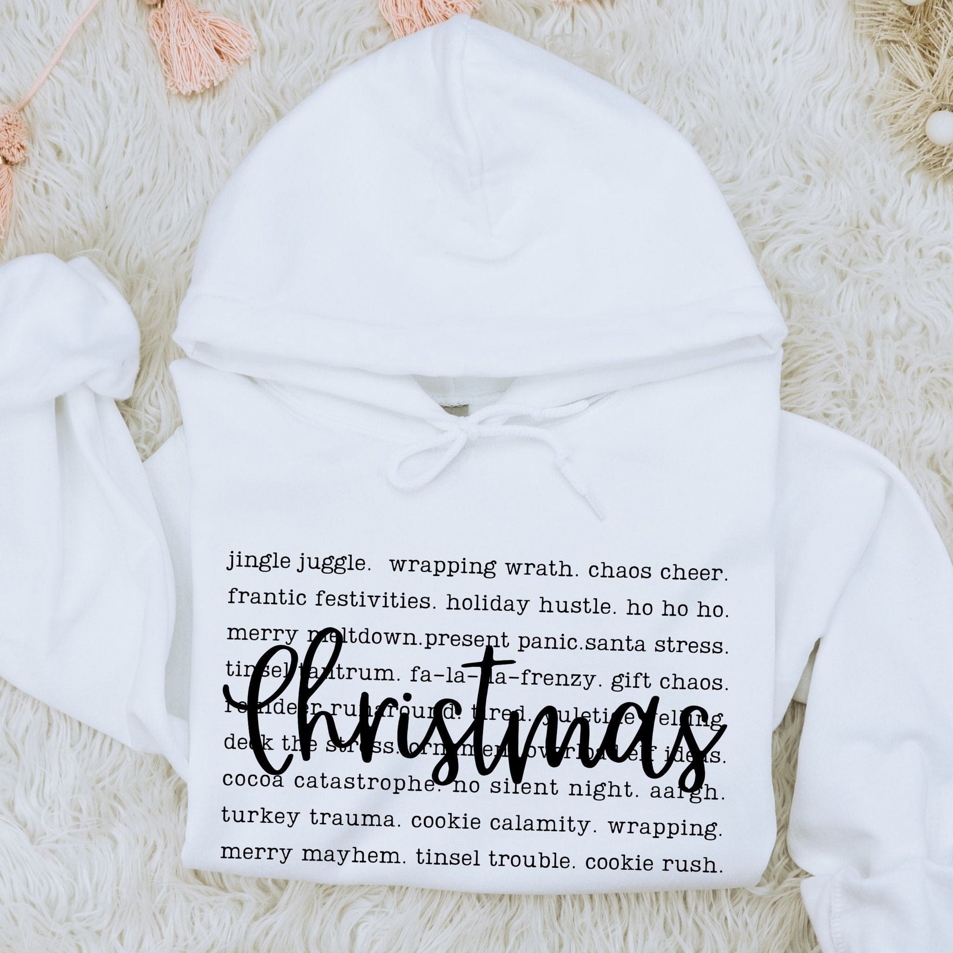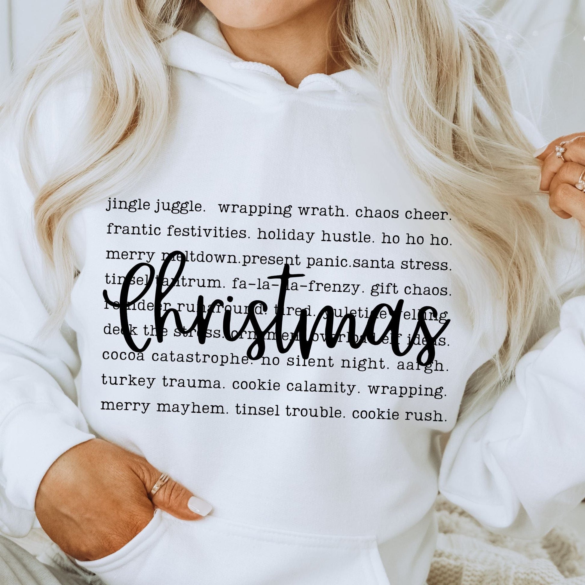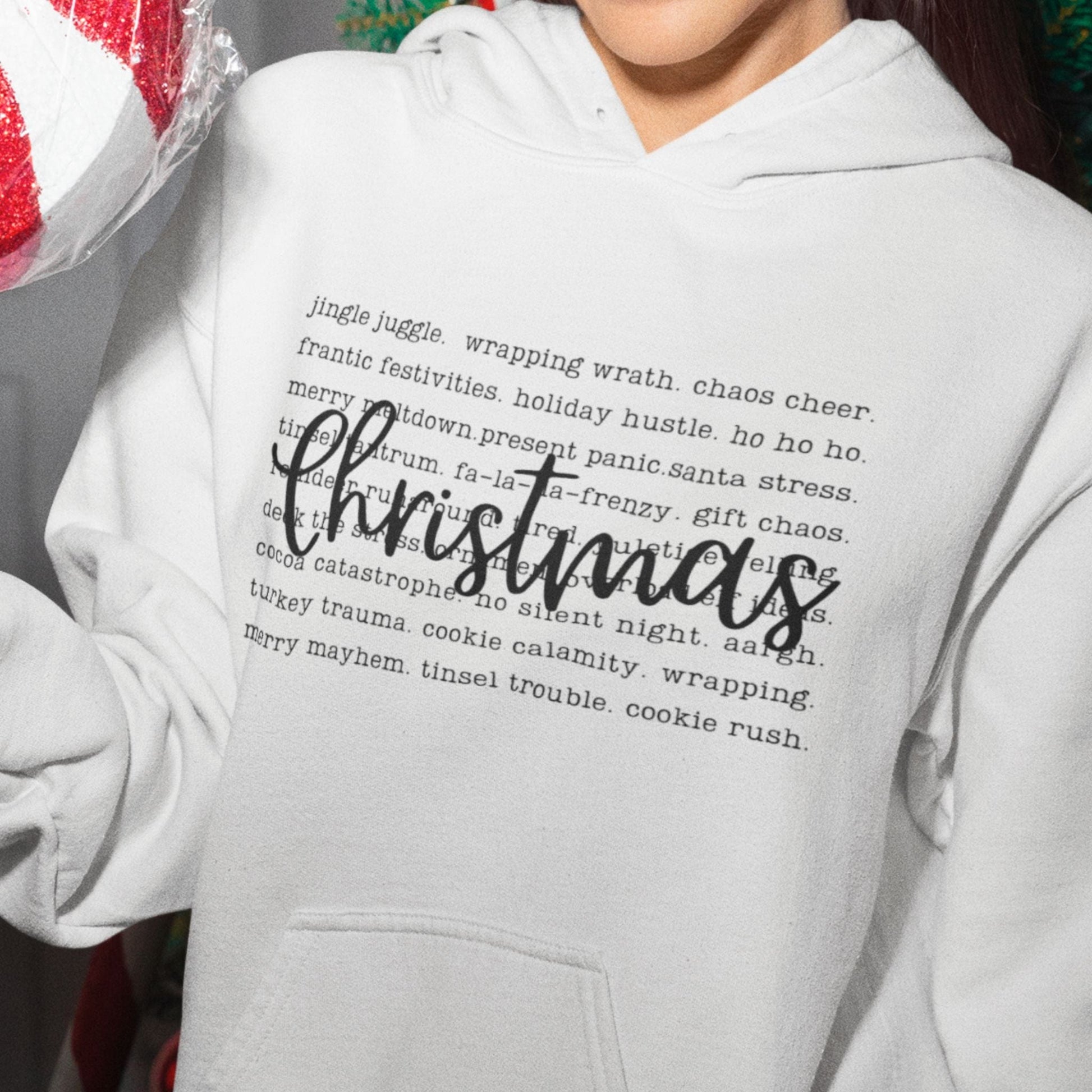 Embrace the chaos with a touch of humor—this cozy, soft, and stylish sweatshirt doubles as a playful checklist for surviving it all. Whether you're dashing through the stores, managing endless to-do lists, or just trying to find a moment of peace, this hoodie keeps you warm and lighthearted. Perfect for moms who juggle it all, this is your must-have for the festive season. Laugh at the holiday hustle while wearing it!